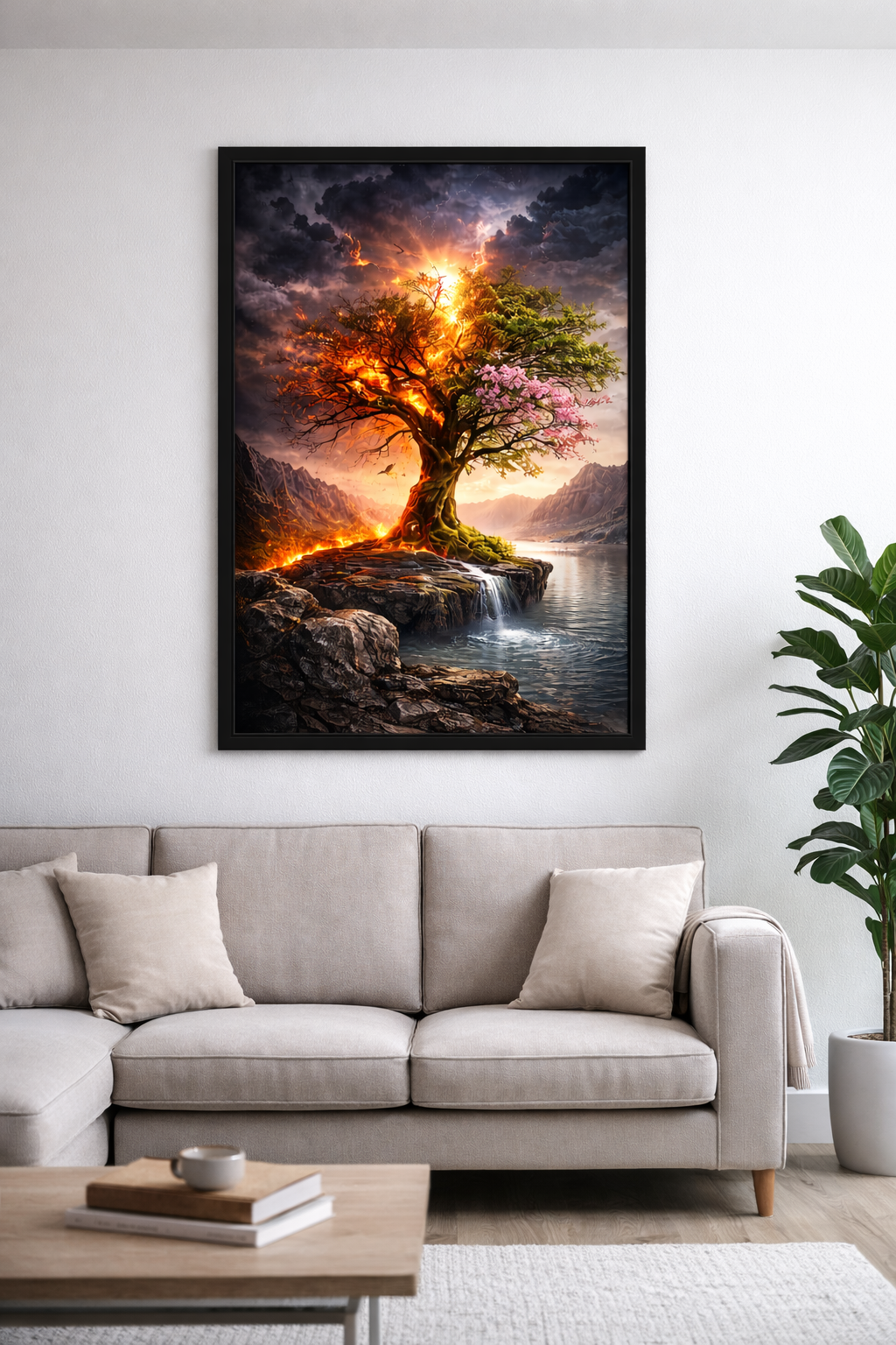 This breathtaking surreal artwork captures a powerful tree divided between flame and bloom ,one side consumed by fire, the other flourishing in vibrant life. Set against dramatic skies and calm waters, it symbolizes resilience, rebirth, and the beauty that rises after hardship.